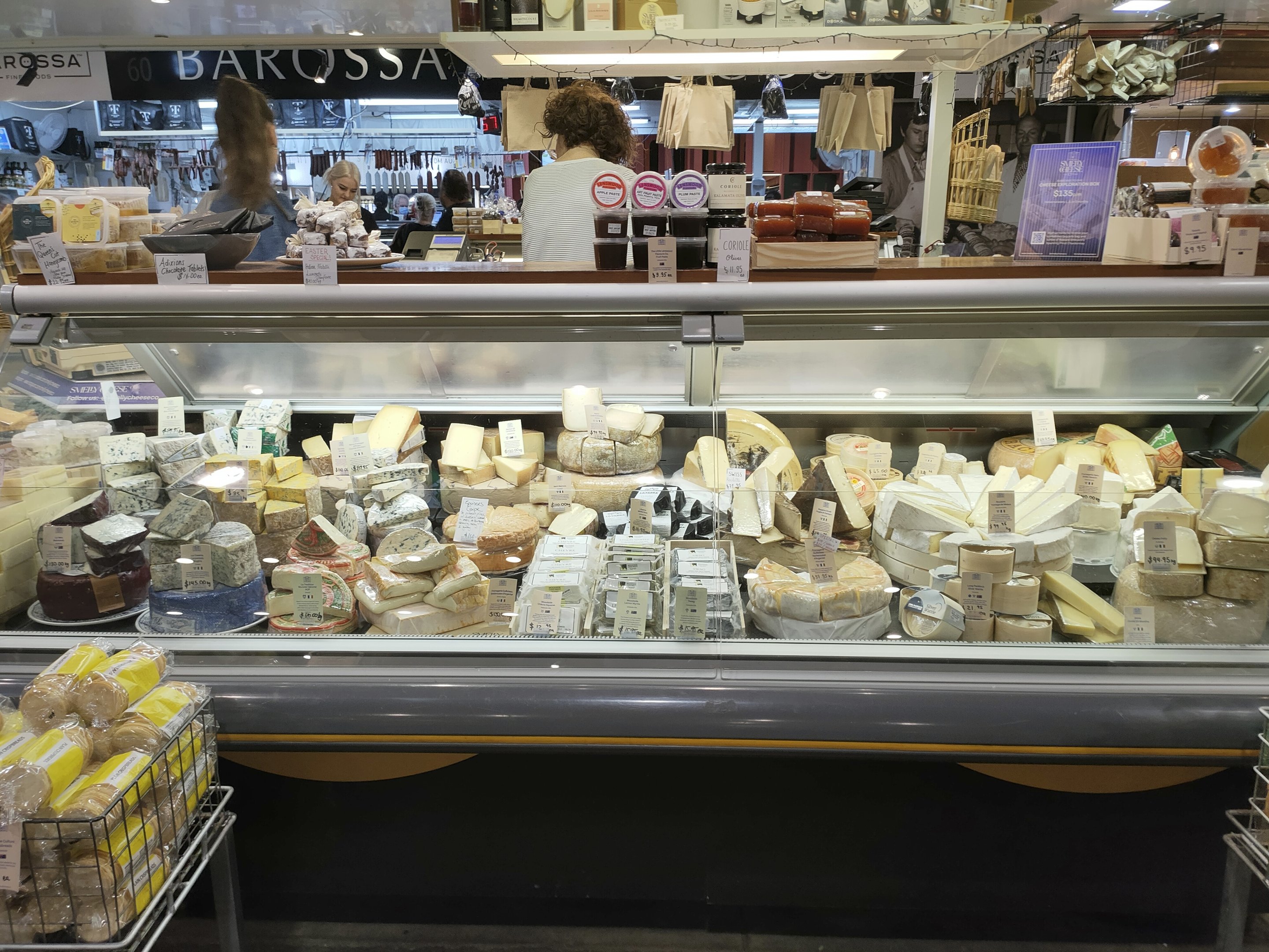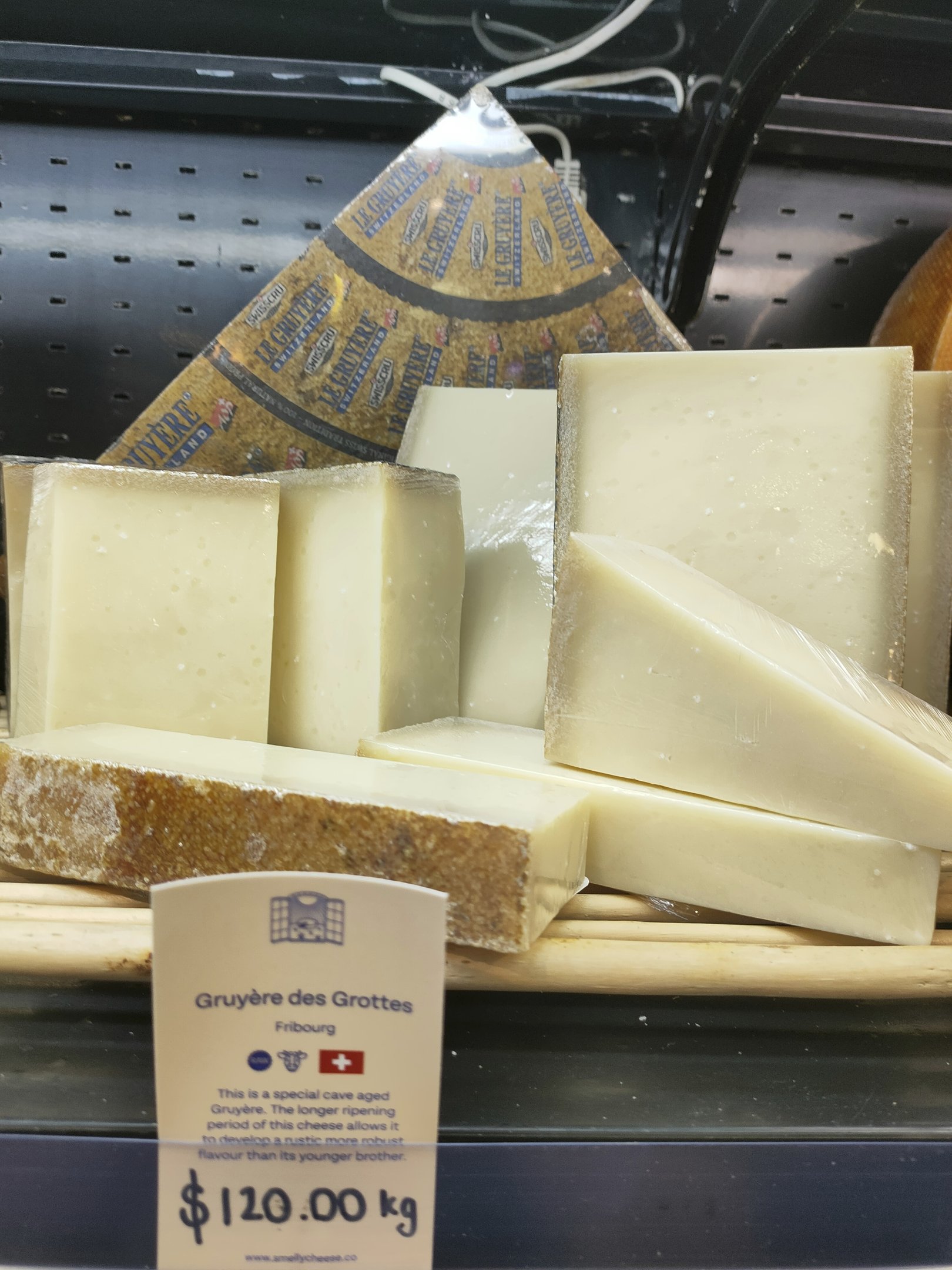 Il y a un choix de fromages de toute l’Europe, d’Australie et beaucoup de Gruyères et même celui des grottes que nous n’avons jamais vu en Suisse